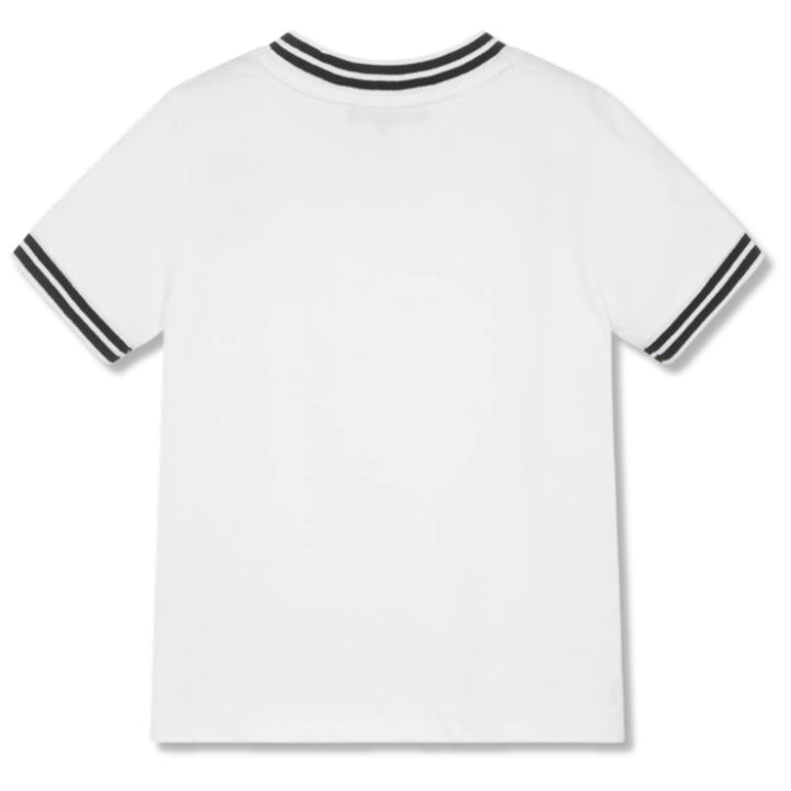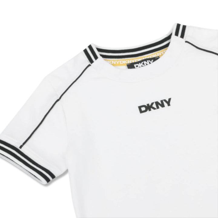 White T-shirt for boys and girls by DKNY, made in soft and comfortable, organic cotton jersey. Ideal for stylish casual wear, it has sporty black stripes on the neckline and cuffs and a distinctive logo print across the front.