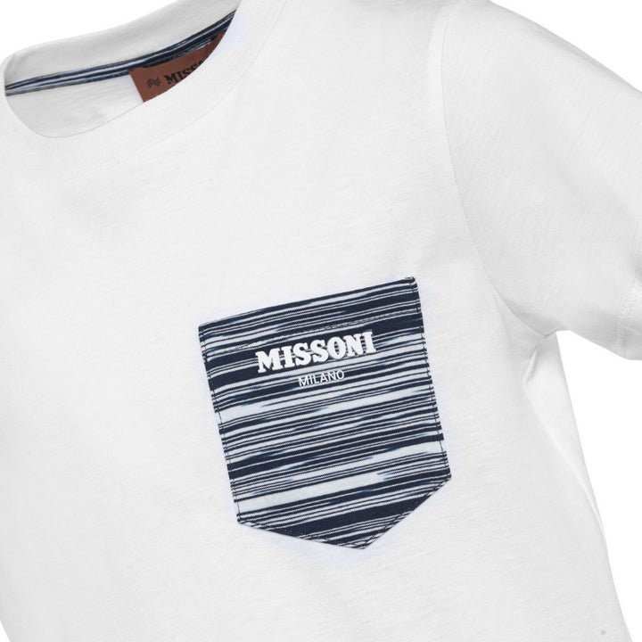 Missoni kids contrasting patch-pocket T-shirt white, cotton, logo lettering,stripe chest patch pocket,crew neck,short sleeves