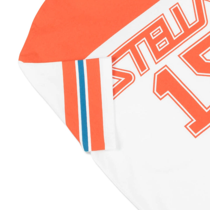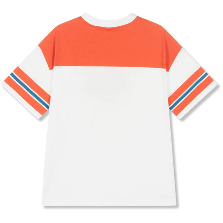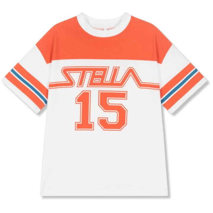 Red and white organic cotton T-shirt for boys by Stella McCartney Kids. It has blue striped trim on the sleeves, with a bold number 15 and statement logo on the front. Casual and comfortable, this oversized tee is made soft jersey.