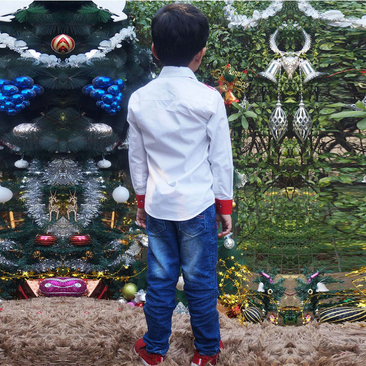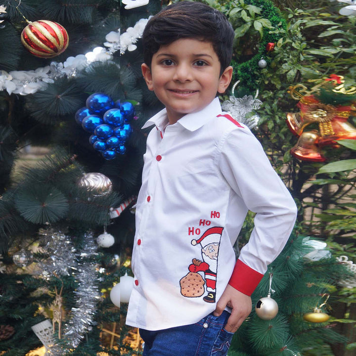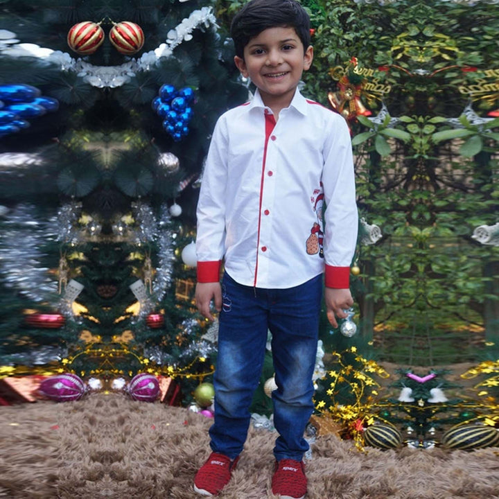 Boys White Santa-Patch Shirts feature a crisp white base with a festive Santa patch on the front, adding a cheerful holiday touch. Made from soft and breathable cotton, this shirt ensures comfort and style for seasonal celebrations. Perfect for pairing with jeans or trousers for a smart festive look.