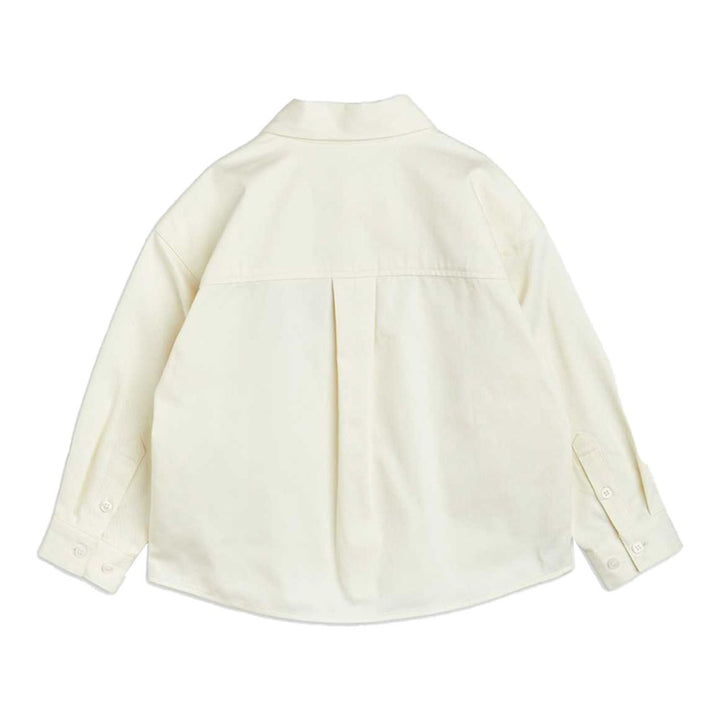 White woven shirt with a Chef Panda print decorating the chest, made from 1 % GOTS certified organic cotton. The shirt has slightly dropped shoulders for a relaxed fit, buttons closing the front and a classic collar.
