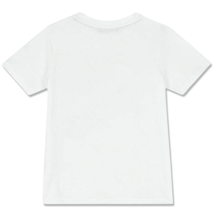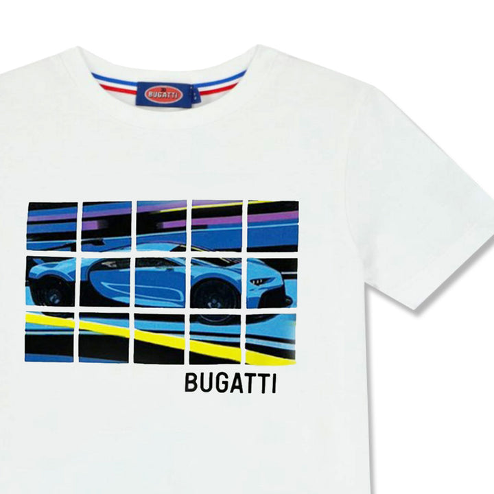White t-shirt for by Bugatti Junior. Made from soft cotton jersey, it features a sports car and slogan print in black on the front. It has the brands logo rubber badge on the chest and blue and red trims on both sleeve.