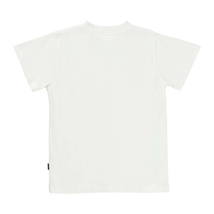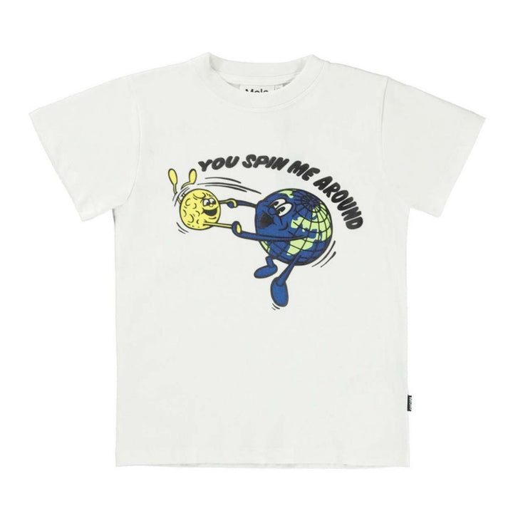 White cotton T-shirt for boys by Danish brand Molo, with a quirky blue and yellow print of the Earth and the Sun on the front. With a logo tab on one side seam, it is made in comfortable jersey, so is ideal for relaxing in all day,
