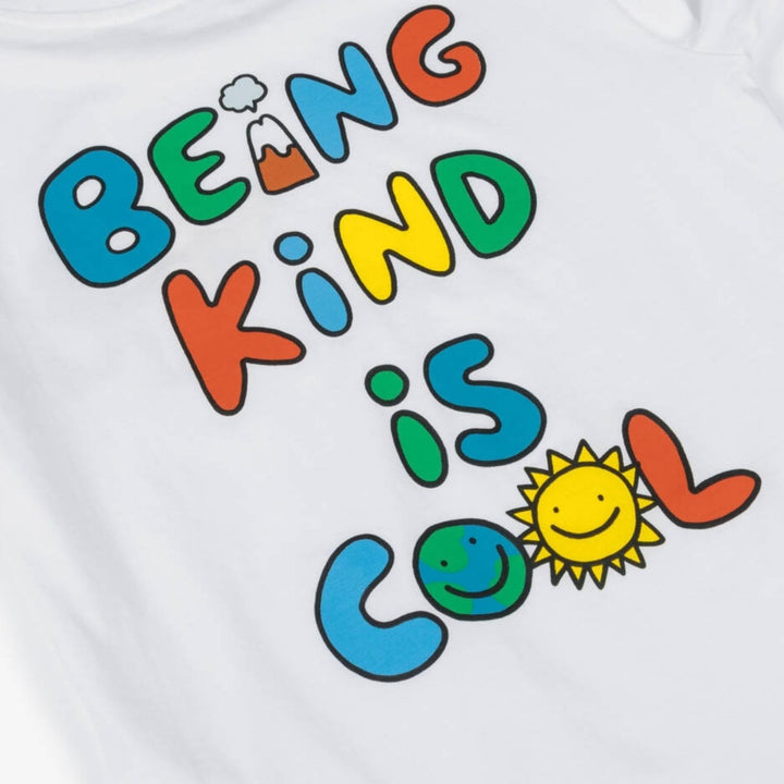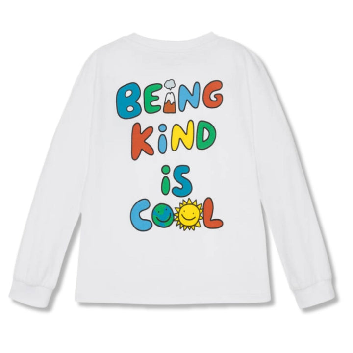 White long sleeve T-shirt for boys by Stella McCartney Kids, made in soft organic cotton jersey. Part of the designers Stay Earthy collection, on the back and front it has colourful prints of the Earth and Sun. and a Being Kind is Cool message.