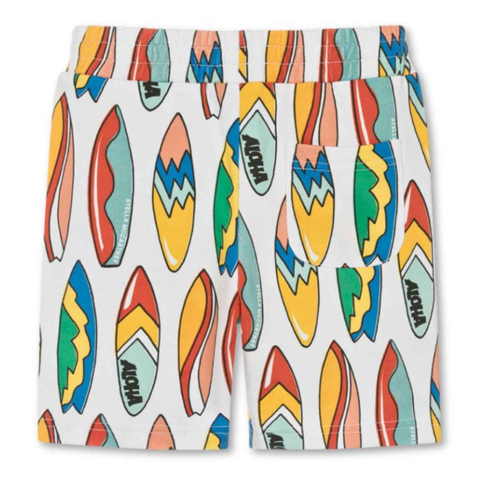 Cool white shorts for boys by Stella McCartney Kids, with a vibrant and colourful surfboard print. Made from soft, mid-weight organic cotton jersey, these comfortable shorts are sure to brighten casual days. Easy to wear, they have an elasticated wai