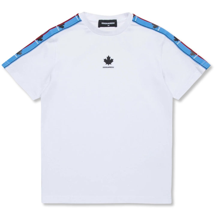 The DSQUARED2 KIDS maple-leaf-print T-shirt in white combines style and comfort with its bold logo print and side stripe detailing. The classic crew neck and 100% cotton fabric make it soft and breathable, perfect for everyday wear with a touch of trendy flair.