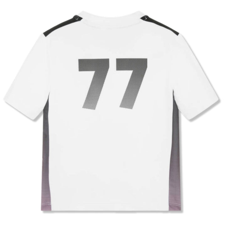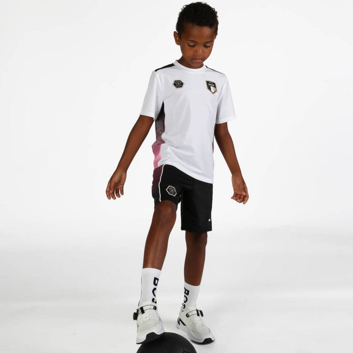 Cool white football T-shirt for boys by BOSS, with a sleek and sporty design, ideal for young athletes. Silky smooth and stretchy, with graduated black and pink dotted trims on the sides, this top ensures comfort and flexibility. There are Team Boss