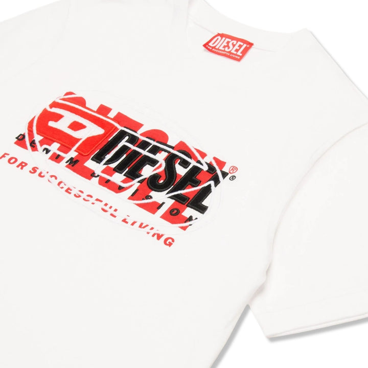 Short-sleeved crew-neck T-shirt in jersey. Oversize fit. Overlapping triple logo with Diesel For Successful Living print, Embroidered Oval D logo and Diesel Denim Division chenille effect patch.