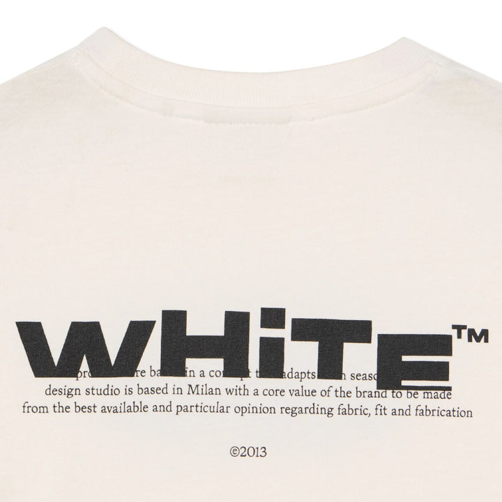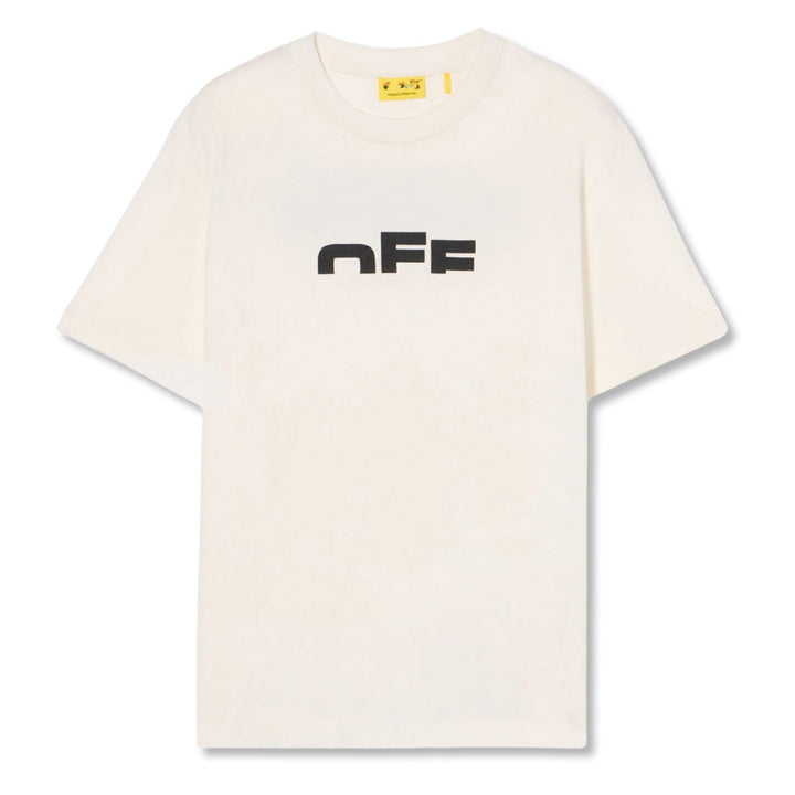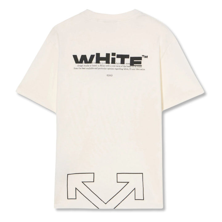 White cotton T-shirt for boys by Off-White, inspired by the adult collection. This casual tee features the brands distinctive wraparound text logo in bold black font for instant brand recognition. It is made in soft jersey for comfortable wear.