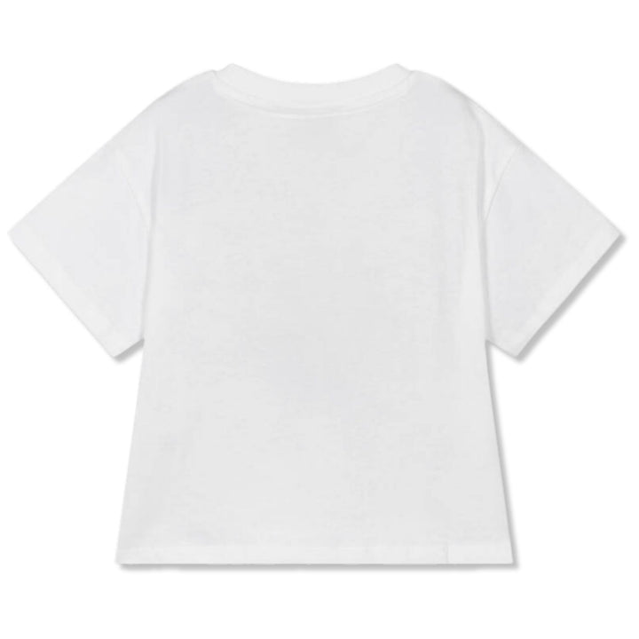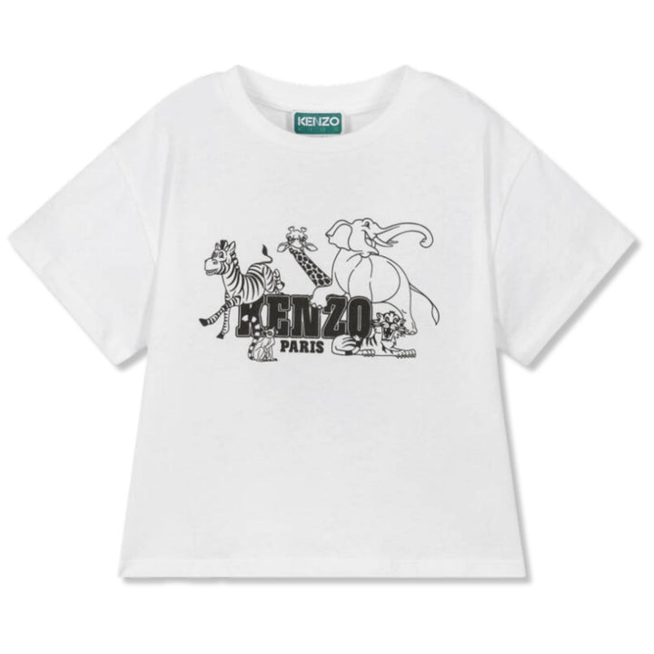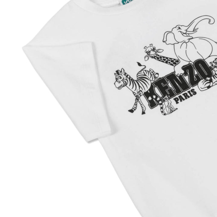 This kids' white Kenzo Paris t-shirt is crafted from soft, breathable cotton for comfort all day long. The front features a playful black line-art jungle motif with zebra, giraffe, elephant, and tiger illustrations encircling the bold Kenzo Paris log