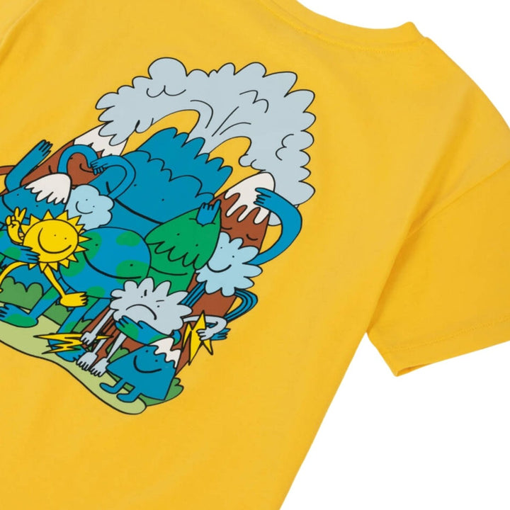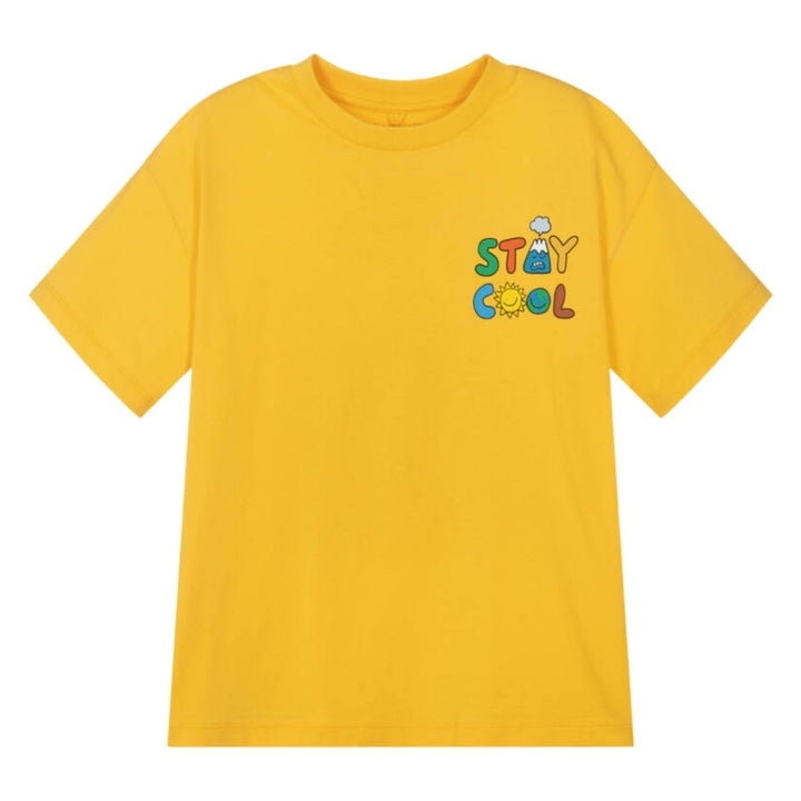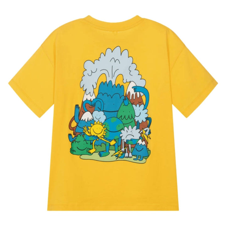 Yellow oversize T-shirt for boys by Stella McCartney Kids, made in comfortable organic cotton jersey. This casual tee showcases a cheerful graphic of planet earth and friends on the back, with a coordinating Stay Cool slogan on the front.