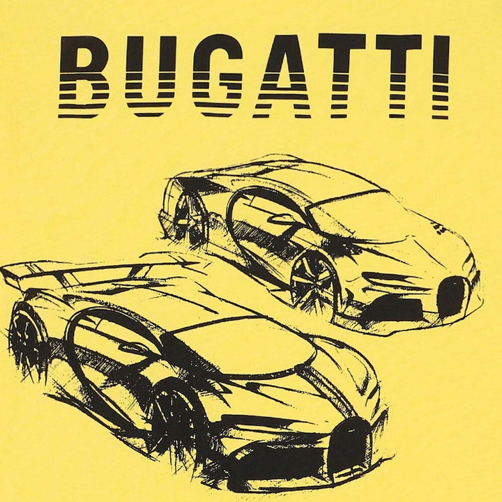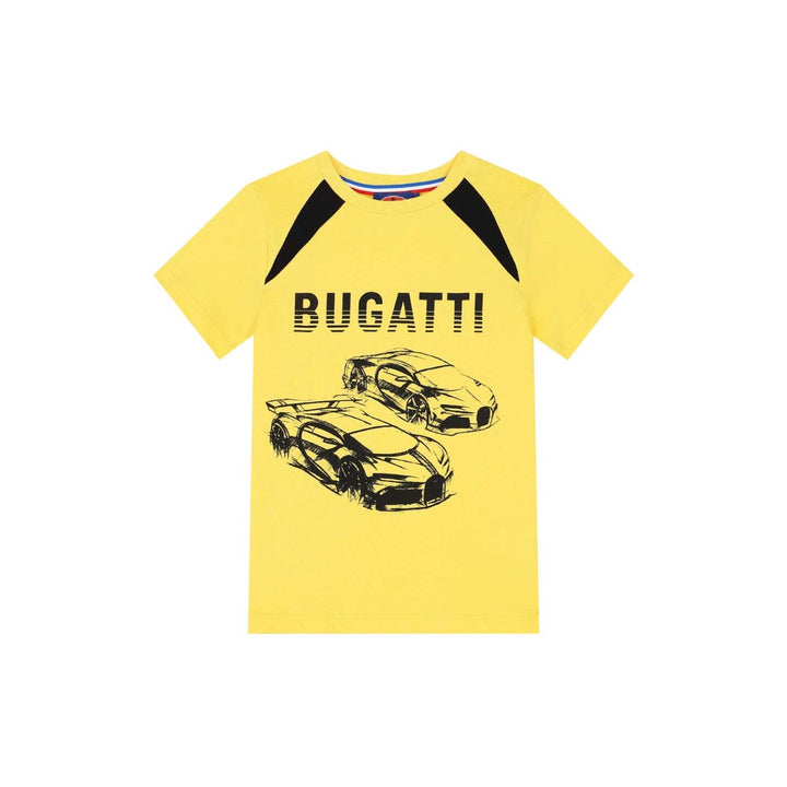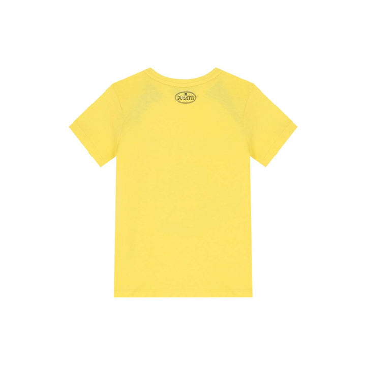 Yellow t-shirt by Bugatti Junior. Made from soft cotton jersey. Features the brands logo and car print in black on the front and the brands logo print in black at the back neck. It has black trim on the front. Fastens with poppers on one shoulder for