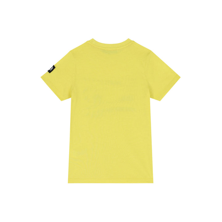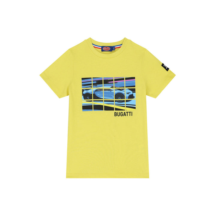 Yellow t-shirt for by Bugatti Junior. Made from soft cotton jersey, it features a sports car and slogan print in black on the front. It has the brands logo rubber badge on the chest and blue and red trims on both sleeve.