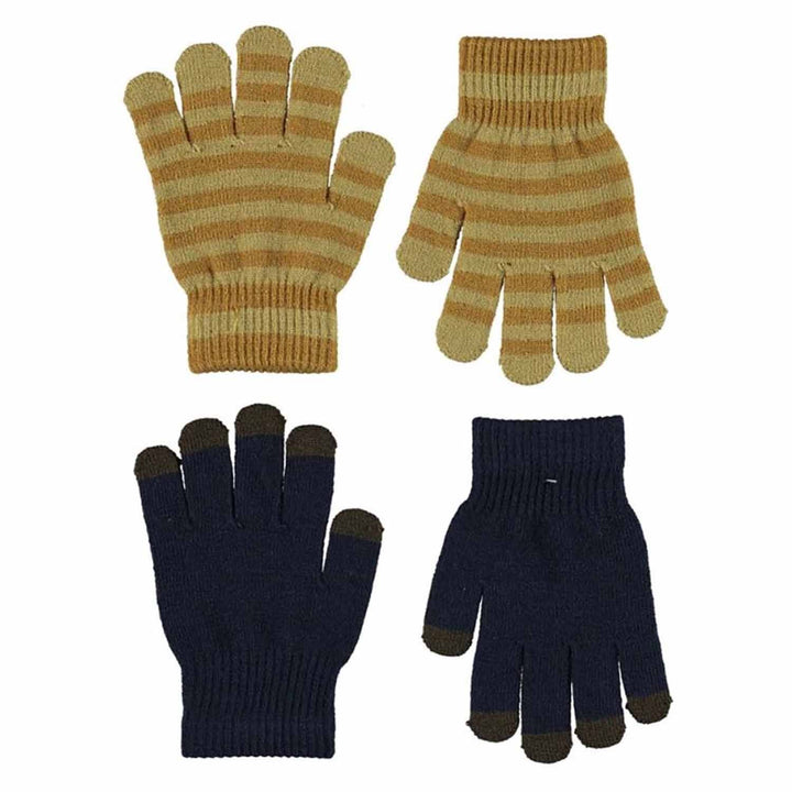 Two pairs of knitted gloves boys for girls from Danish brand Molo. One pair finger tip details and the other pair is in brown, black and Grey stripes. Soft and comfortable, both have stretchy ribbed cuffs.
