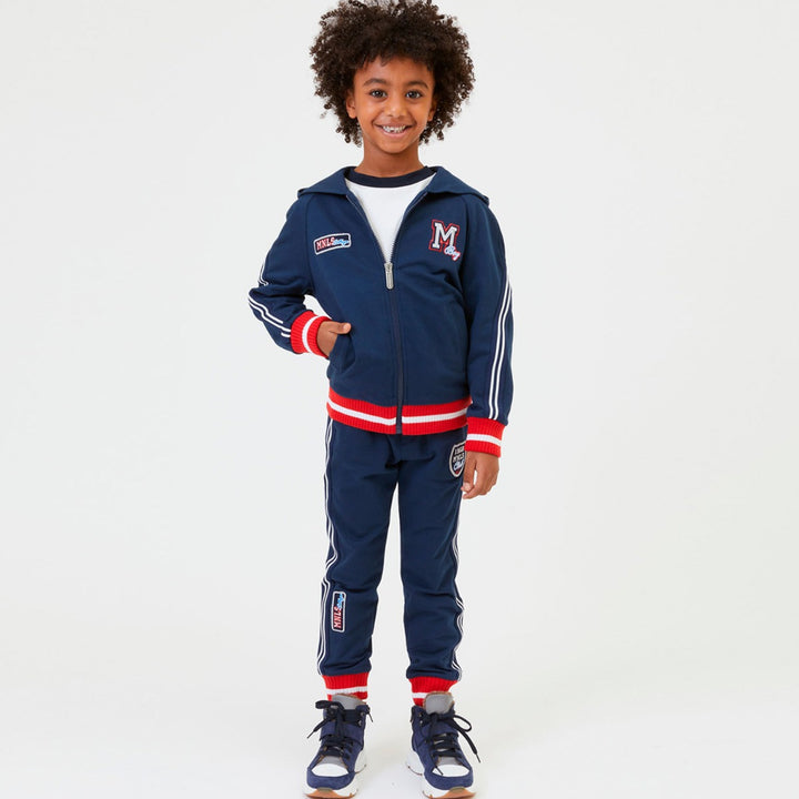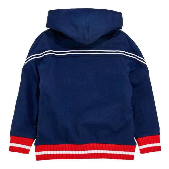Brushed fleece with coloured bands Hoddie for boys by Monnalisa .Practical for every-day wear, the sporty garment par excellence, the open hooded sweatshirt with bands.