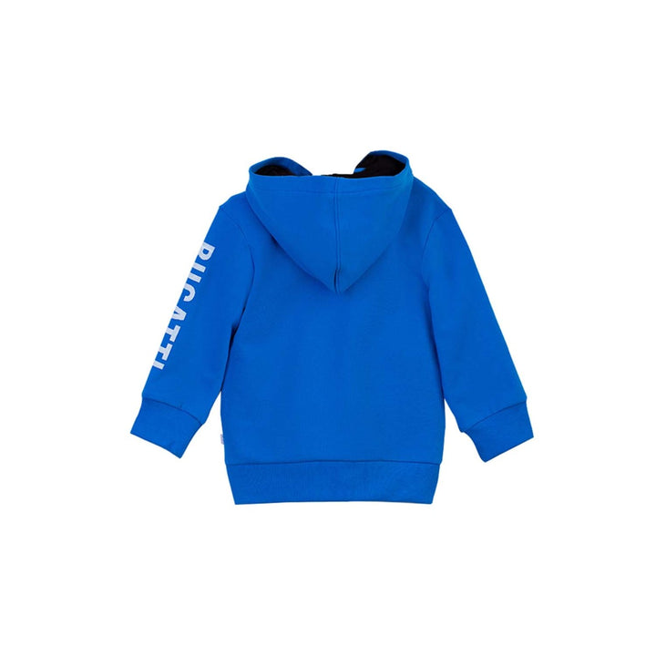Blue and white long sleeve sweat Jacket for younger boys by Bugatti Junior. Made from soft cotton, it features the brands logo in the front.