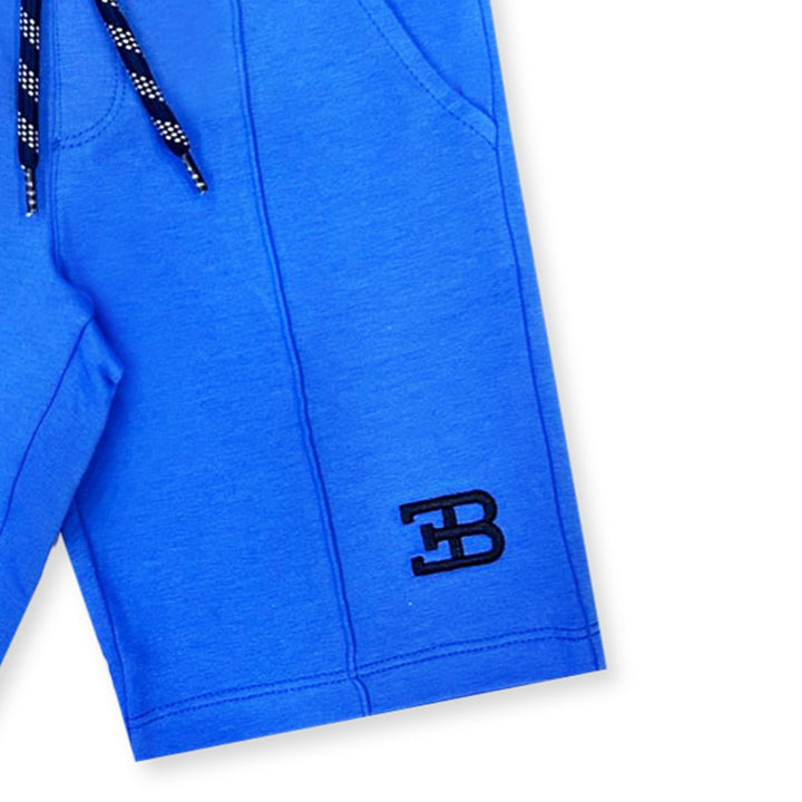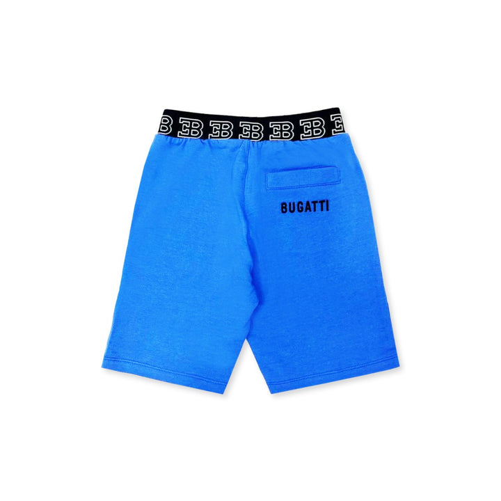 Navy blue logo shorts for boys by Bugatti Junior. Made from soft cotton. Features the embroidered brand logo in metallic gold on the front and at the back. They have a three pocket styling. Finished an elasticated logo waistband and drawstring for comfortable fit.