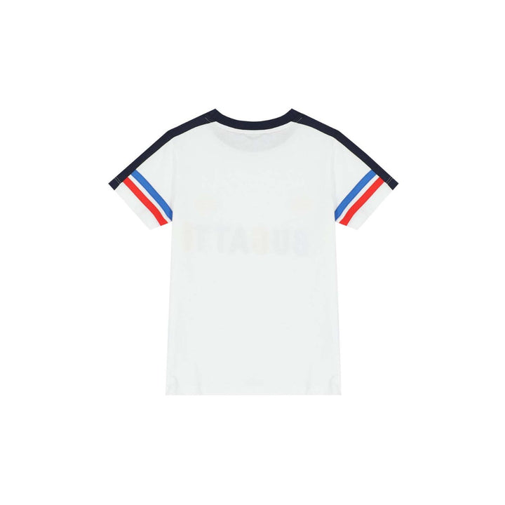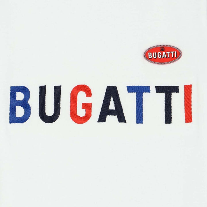 White logo t-shirt by Bugatti Junior. Made from soft cotton jersey, it features the brands logo embroidered in navy blue, red and rubber logo badge on the chest. It has navy blue trim, red and blue striped on the sleeves.