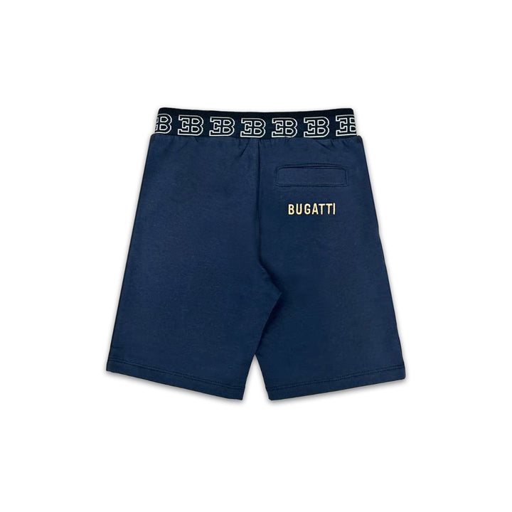 Navy blue logo shorts for boys by Bugatti Junior. Made from soft cotton. Features the embroidered brand logo in metallic gold on the front and at the back. They have a three pocket styling. Finished an elasticated logo waistband and drawstring for comfortable fit.