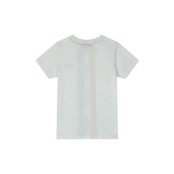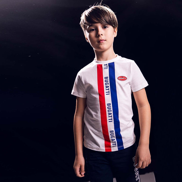 Boys white logo t shirt by Bugatti Kids. Made from soft cotton, it features a signature red and blue striped and the brand logo print on the front. Round neck with half sleeves.