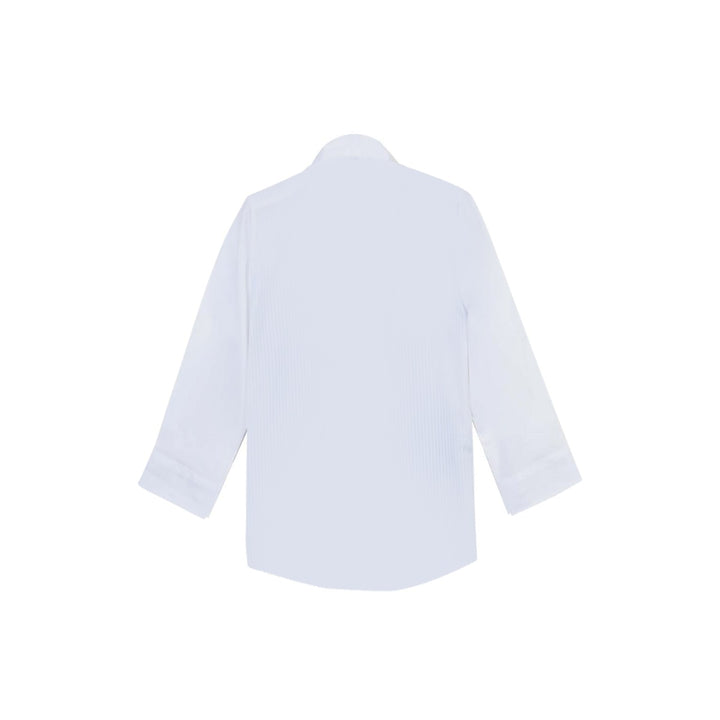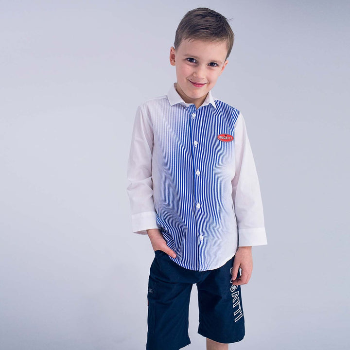 Boys white logo shirt by Bugatti Kids. Made from soft cotton, it features a stripped print pattern and logo badge on the chest. Collared neck with button down closure and long sleeves.