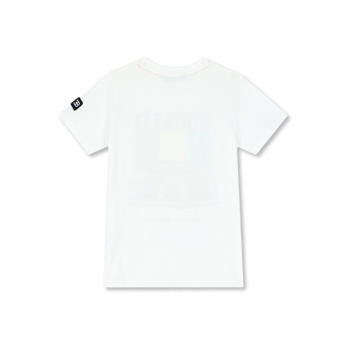 White logo t-shirt for boys by Bugatti Junior. Made from soft cotton jersey. Features the sports car and brand logo in white on the front. It has slogan print and blue, yellow and grey trims on the front.