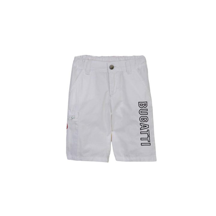 White shorts by Premium Designer Buggati. It has a black buggati logo in front and a waistband with button to tighten and for a comfortable fit.