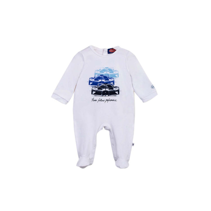 white babygrow by Bugatti Junior. Made from soft pima cotton , with navy blue, white and pale blue panel .Features the brands logo and sports car print in white on the front. It fastens with poppers at the back and between legs for easy dressing.