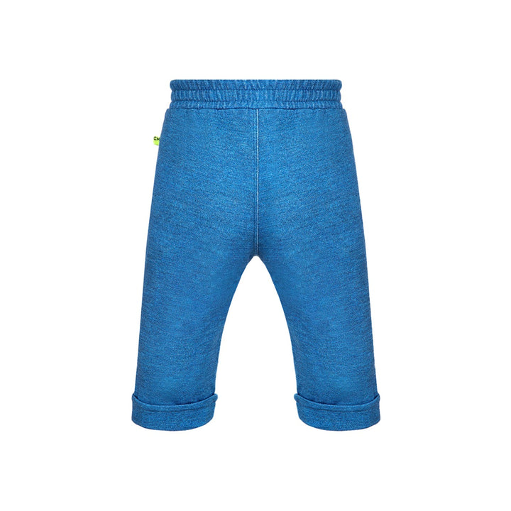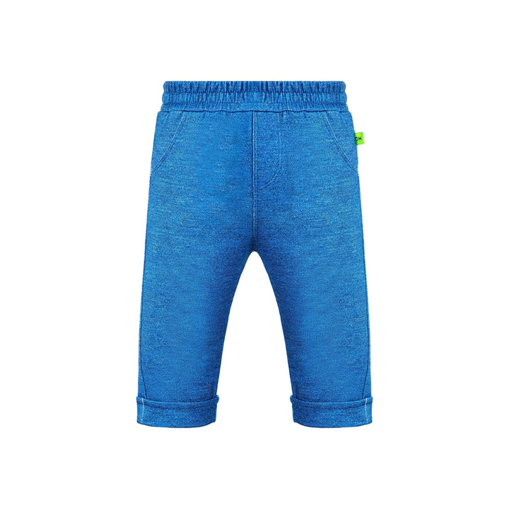 These pants for a boy look almost like real jeans. Straight cut trousers are made of blue knitwear with imitation of denim fabric. the pockets-decores and a pseudo-zip. Wide soft belt with elastic band. On the left leg is a themed chevron. The length of the trousers is easily adjustable depending on the height of the child - the product can be bought for growth.