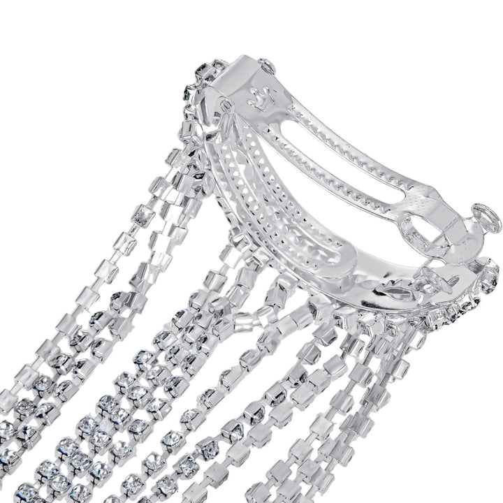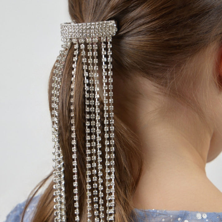 This hair clip features elegant long silver strings adorned with sparkling crystals, creating a sophisticated accessory for girls. Its graceful design adds a refined shimmer to any hairstyle, perfect for special occasions or elevating everyday looks.