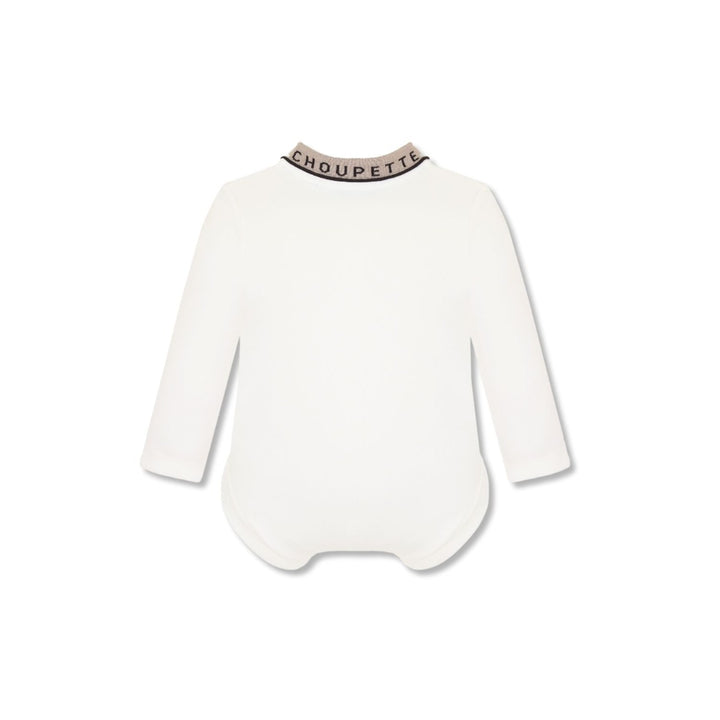 The bodysuit with buttons is made of natural cotton in ecru color. The convenient fastener is located along the entire length of the product, as well as between the legs. The elastic collar in a contrasting color gives the productstylish look. The bodysuit has long sleeves, which gives comfort and warmth to the baby. Soft and pleasant to the touch fabric, comfortable fit and cut provide freedom of movement of the child, so the model is ideal for everyday wardrobe.