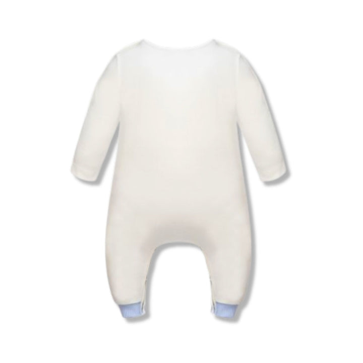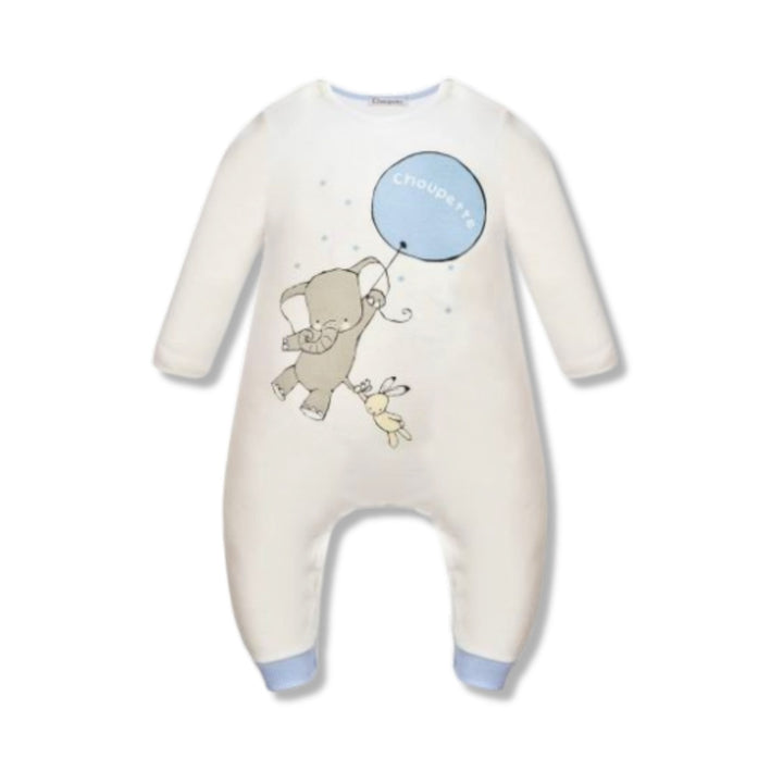 Beatiful ecru jumpsuit with printed little elephant and bunny will bring smile on your face. Snap buttons will allow easily to put on or off or just to change dipper of a baby.