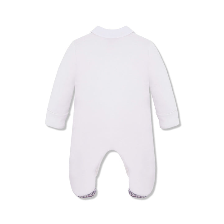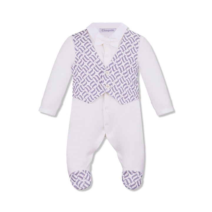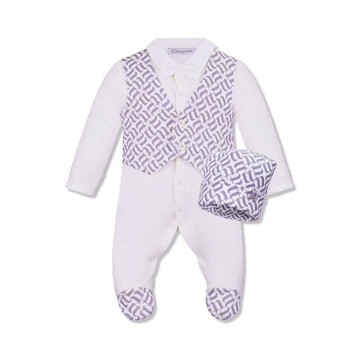 An elegant set for discharge with a decorative tailcoat is a great option with branded print for the most important and exciting event in the life of a baby and his parents. The set includes a jumpsuit decorated with a stylish decorative tailcoat. The model with long sleeves and closed legs has convenient vertical fasteners that will turn the process of dressing into a pleasure. The set also includes a knitted cap with ties.