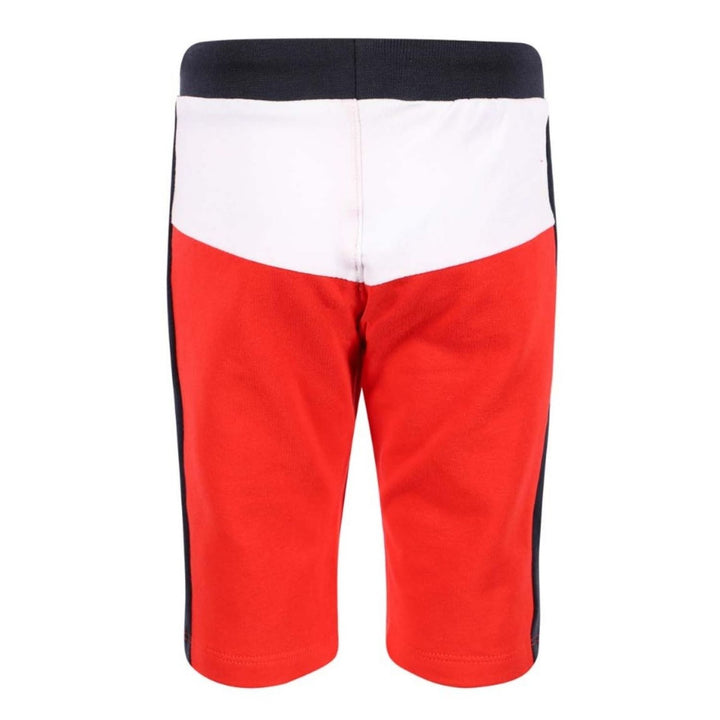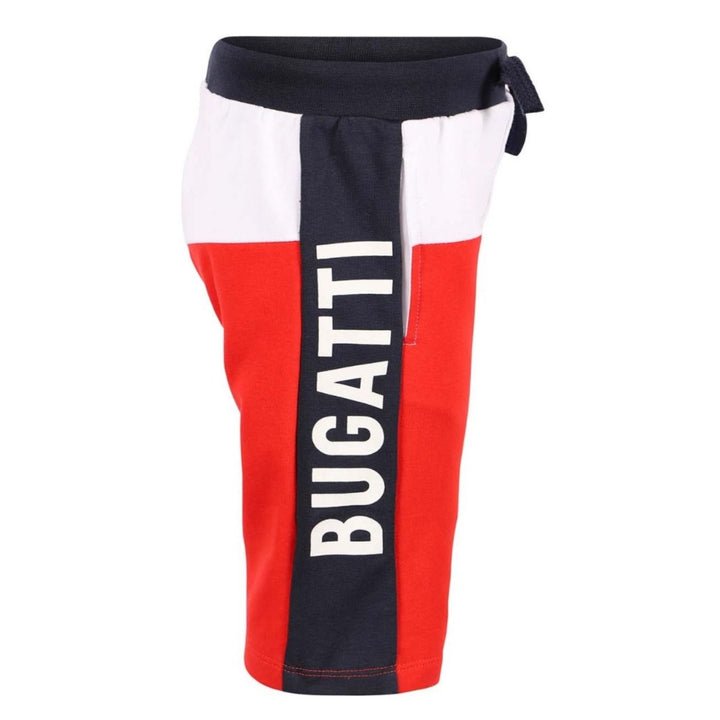 Colour‑block shorts featuring a navy waistband, white upper panel and bold red legs for a sporty look. The sides are detailed with large BUGATTI branding, while the drawstring waist and mid‑length cut ensure a comfortable.