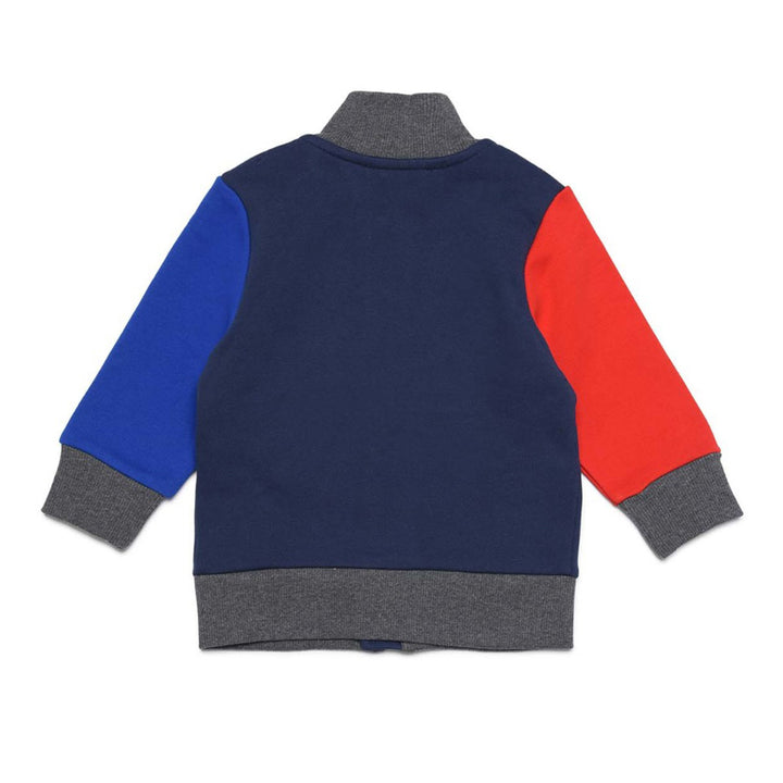 Color block sweatshirt in French Terry, long-sleeve, with high collar, front zip closure, ribbed finish on the cuffs and hem, colored logo detail on top left and contrast oversized front pocket.