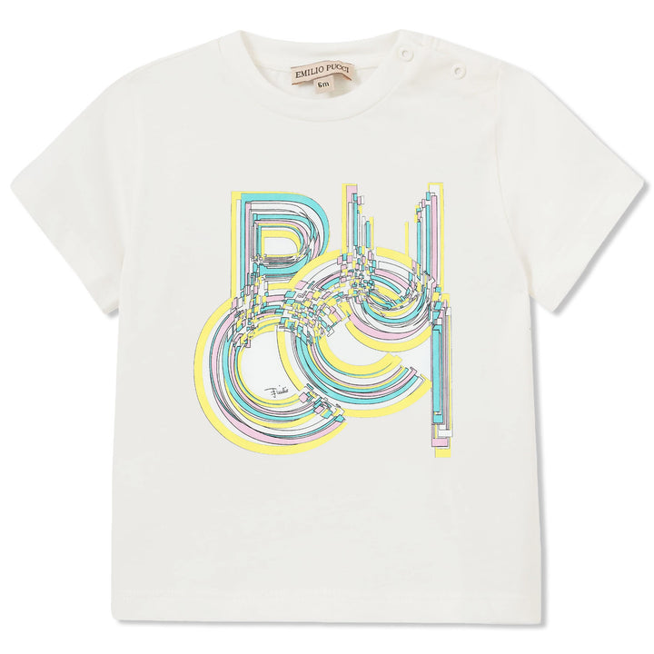 Crafted in Italy, this white T-shirt is emblazoned with an explosion of pastel-coloured shapes that spell out Pucci. It?s cut from soft cotton jersey with a hint of stretch and features a crew neck with a press-stud fastening and short sleeves.