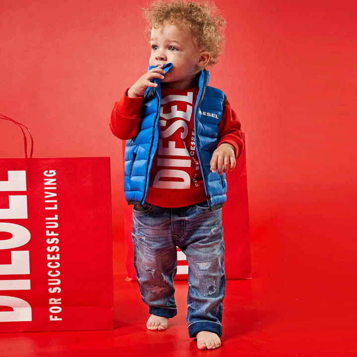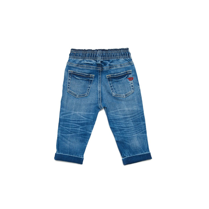 Five-pocket, boyfriend fit jeans in a contemporary style, with drawstring waist, treatments and breaks, made of blue stretch denim.