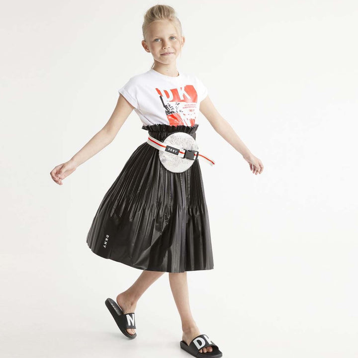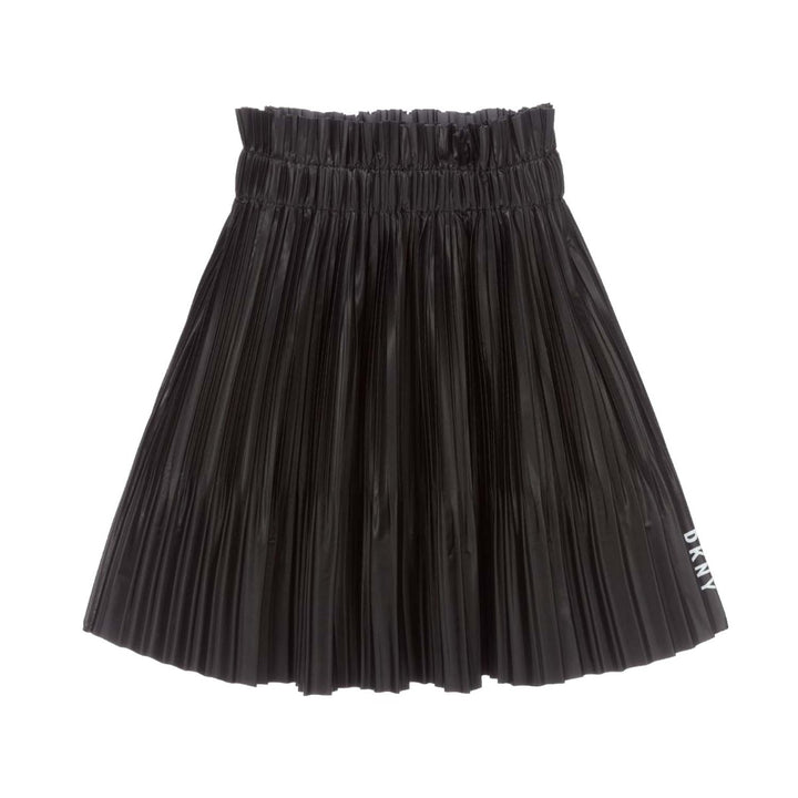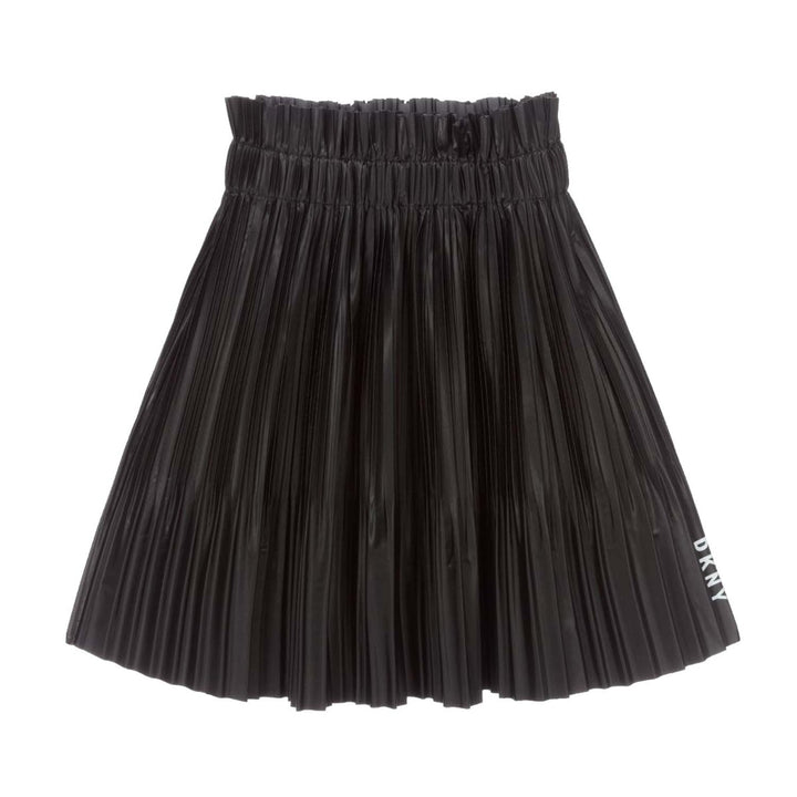Black pleated skirt for girls by DKNY. Made in silky and lightweight fabric with a pearlised sheen, this modern design features a stretchy ruffle waistband, a raw-edged hemline and logo print.