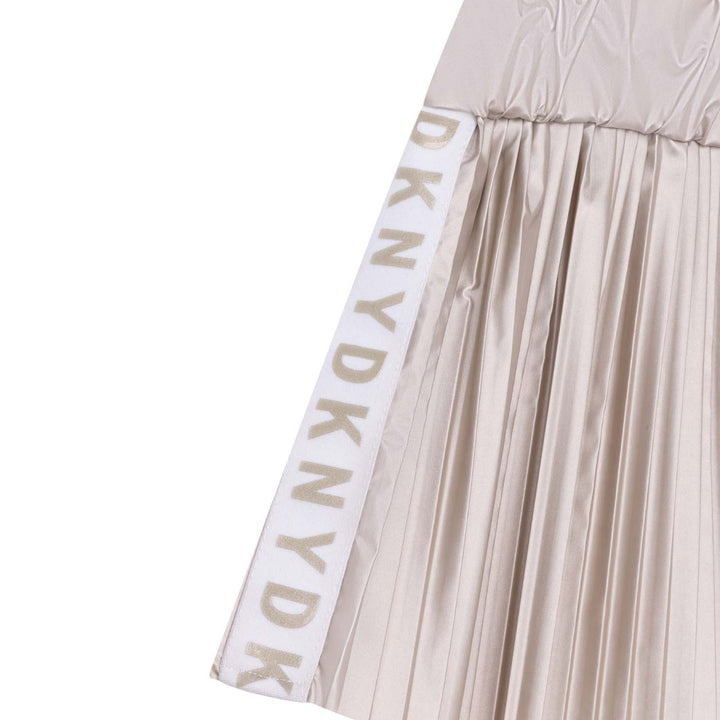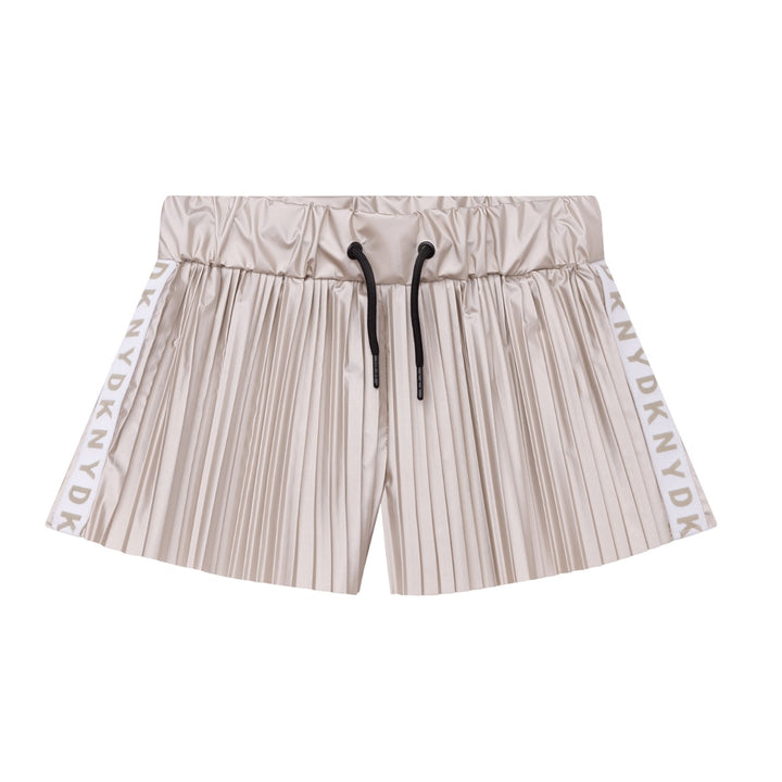 Gold pleated shorts for girls by DKNY. Made in silky and lightweight fabric with a pearlised sheen and fully lined, this modern design has an adjustable drawstring waistband and rubberised logo tape trims on the legs.