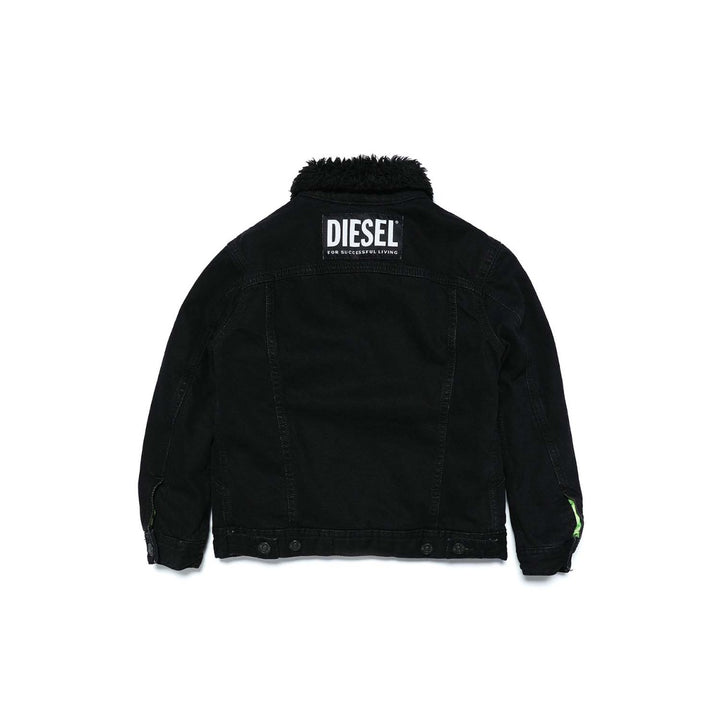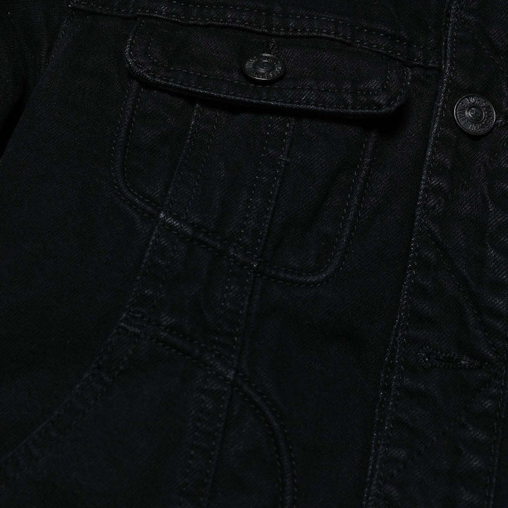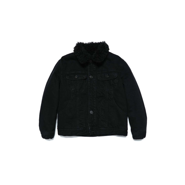 Long-sleeve black denim jacket with teddy fleece lining and front button closure.