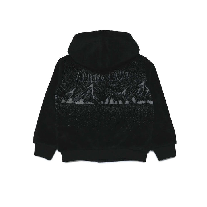 Black jacket in blend of fabrics, with print on back, in jacquard and teddy mixed with quilted nylon. With hood, long sleeves with elastic cuff, elasticated hem and applique logo patch. Part of the AREA 78 collection which takes us into space.