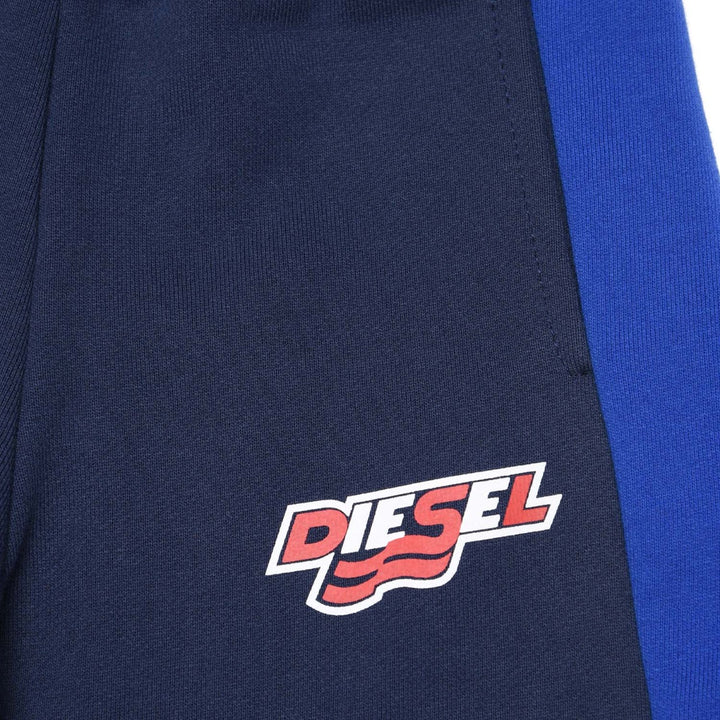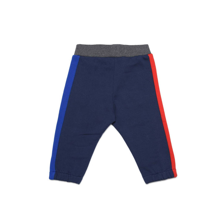Blue pants in French Terry, with contrast side fabric inserts and colored logo on left side.