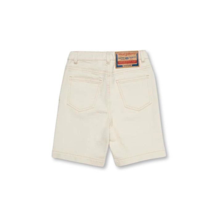 Shorts in ivory stretch denim. Ideal for a casual streetwear style. The garment is part of the Diesel Library pack of iconic and timeless pieces. What are the three characteristics responsible for Diesel Library. The fabrics used are made from low-impact materials such as organic and recycled fibres, the treatments are carried out using innovative techniques that drastically reduce the consumption of water and chemicals, the finishes are selected to ensure efficient and responsible management of resources.