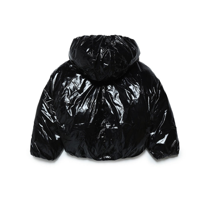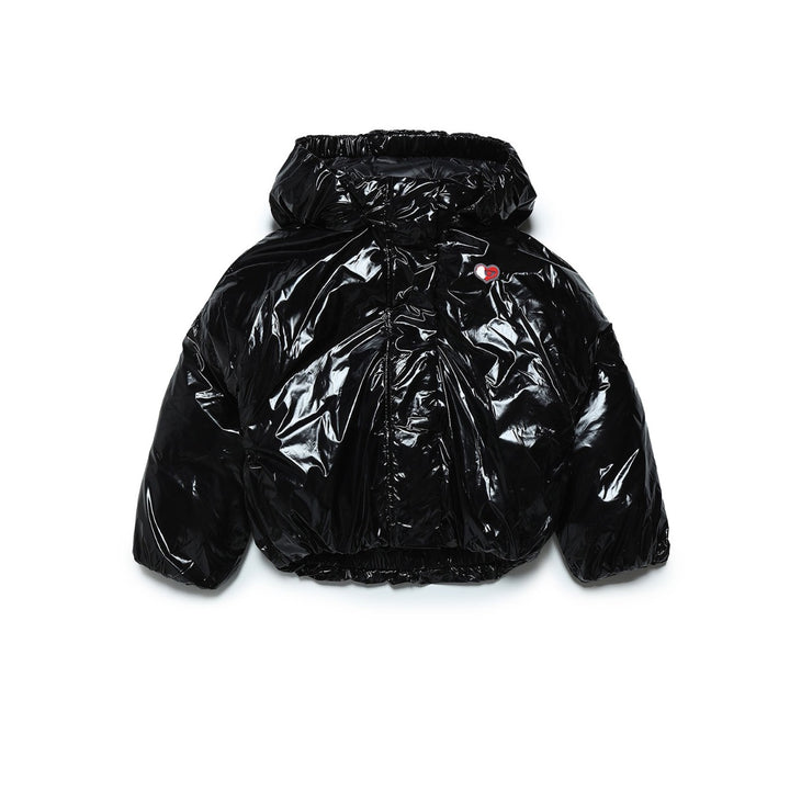 Padded jacket in a feminine silhouette made of shiny effect nylon, with removable hood, double zipper and button closure. It features a heart-shaped applied logo patch on the front. The filling is fake down jacket.