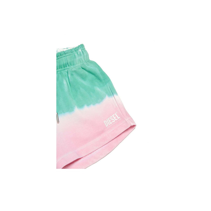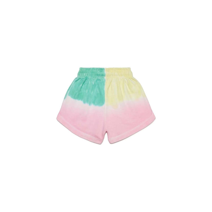 Multicoloured fleece shorts with drawstring waist, featuring pastel colours and a summer mood. They feature a contrasting logo on the leg.