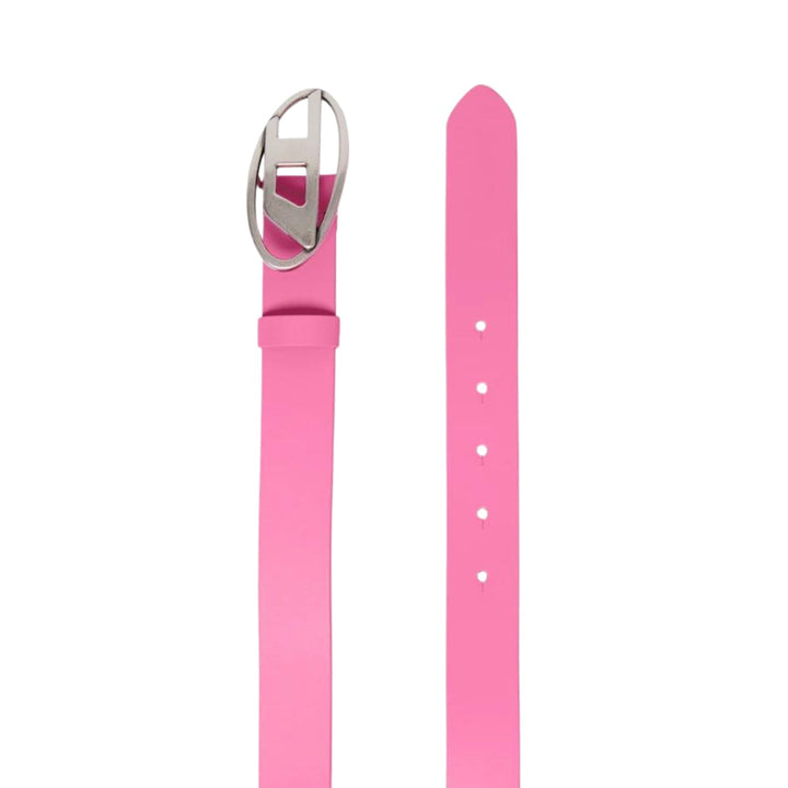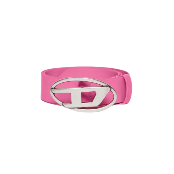 Genuine cowhide leather belt, embellished with a large metal D logo plaque on the front. The article is part of the Diesel Fashion Show line inspired by the adult fashion show.\