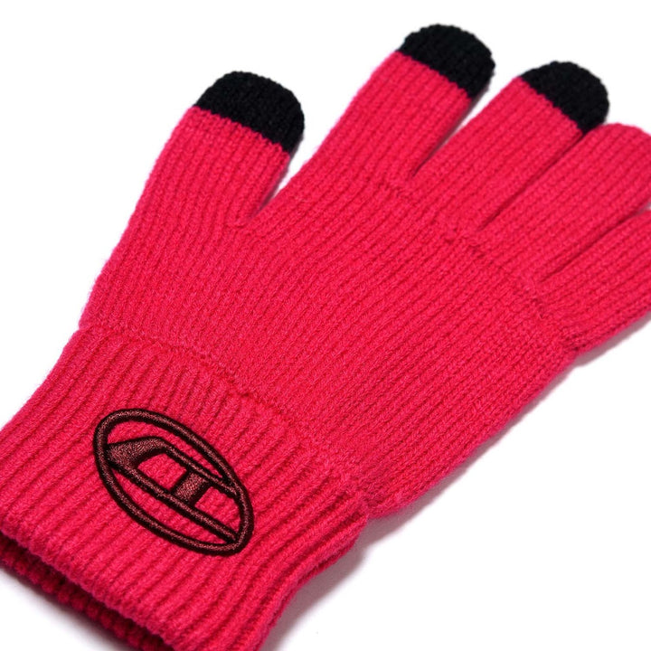Red gloves with contrasting color touchscreen tips on the first three fingers to enable the use of smartphones and other devices without having to take them off. Oval D detail on cuff.