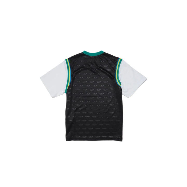 Short-sleeved, V-neck t-shirt in technical fabric with allover logo. It features a contrasting brand logo on the front and details that mimic the layering of a tank top over a t-shirt. The garment, reminiscent of basketball players uniforms, is part of the Diesel Basket Capsule dedicated to the world of basketball.