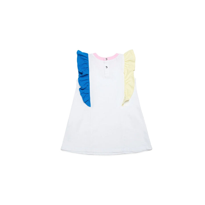 Sleeveless, jersey dress with collar and ruffles on the shoulders in a contrasting colour, multicoloured Diesel Industry logo on the front and press stud fastening on the back.