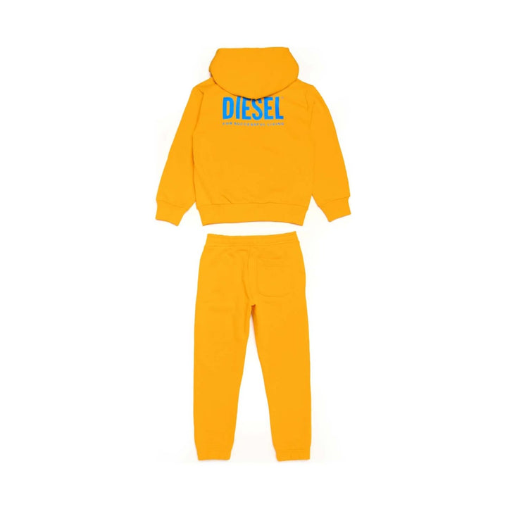 Yellow tracksuit set consisting of long-sleeve hooded sweatshirt with front zip closure, oversized pocket and ribbed finish on the cuffs and hem. Contrast logo detail on top left and oversized version on the back. Pants with elasticated hem and waist with adjustable drawstring, side welt pockets, back pocket and contrast Diesel logo detail on left leg.
